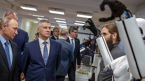 В Петрозаводске Владимира Путина ждала прежде всего выставка достижений Агентства стратегических инициатив (АСИ). Главной достопримечательностью, без сомнения, являлся робот Руслан, вернее его бюст, укрепленный на крытом ниспадающей до пола черной тканью постаменте. Робот был телеуправляемый, рядом с ним сидел оператор, чьи движения Руслан более или менее достоверно воспроизводил. Мне рассказали, что накануне Руслан повел себя своенравно, то есть в какой-то момент, по примеру оператора, на все вдруг стал показывать один-единственный, тот самый палец. При этом оператор отнекивался, отводя глаза, и утверждал, что это не он, причем, судя по всему, говорил все-таки правду. То есть в роботе проснулась мыслящая активность, что было бы, наверное, приятной неожиданностью для его создателей, если бы не предстоящее свидание Руслана с Владимиром Путиным.